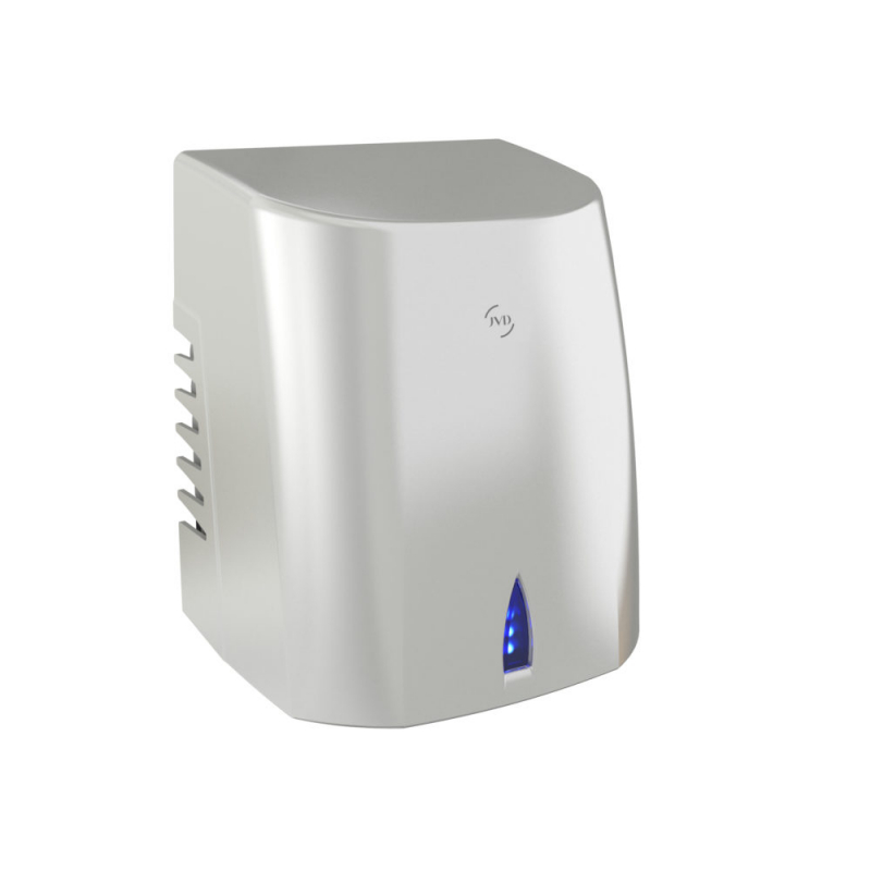 Handtrockner aus weißem Kunststoff, automatisches Ein-/Ausschalten durch Infrarotsensor.